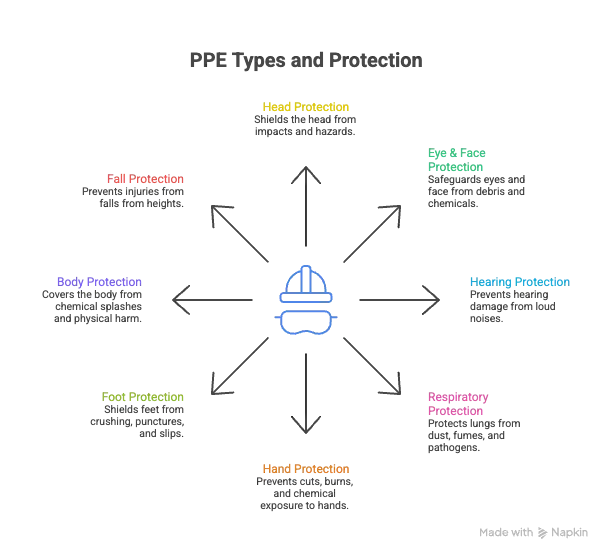 There are several types of PPE, and each type is designed to protect a specific part of the body. Below are the main categories of PPE used across different industries.